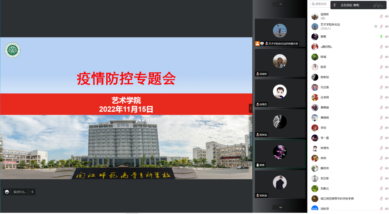 11月15日晚,艺术学院党委书记江柳青主持召开线上疫情防控专题会,传达学习贯彻中共中央政治局常务委员会会议精神和省市有关疫情防控工作的部署要求,听取近期学院疫情防控工作情况汇报,深入研判当前疫情形势,对有序做好恢复线下教学进行部署安排。学院全体中层以上干部、辅导员、甘蔗校区班主任参加会议。