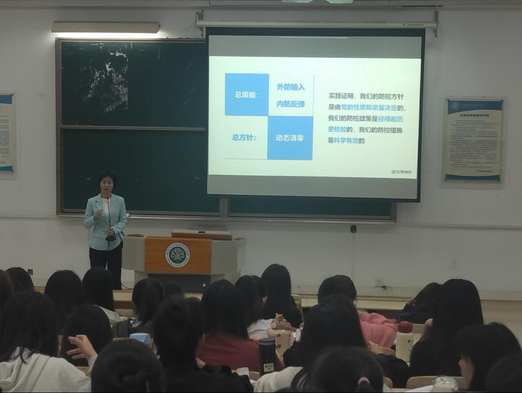吴春艳以“高效统筹疫情防控和经济社会发展”为主题,从“疫情防控措施科学有效”、“经济社会发展稳中向好”、“坚定夺取双胜利的信心”三个方面为学生作了详细讲解。她结合自身参与疫情防控的亲身经历,用翔实的数据,生动的案例、身边感人的故事,深刻阐释了我国疫情防控政策为何是科学有效和可持续,指出“躺平”不可取,“躺赢”不可能。面对新冠肺炎疫情给世界各国带来的冲击与挑战,她谈到我国经济社会发展稳中向好的形势。面对疫情防控和经济社会发展新局势新问题,她指出,我们要坚定夺取双胜利的信心。她还就同学们关心的就业问题,介绍了学院22届毕业生高质量就业情况及国家和当地政府帮助毕业生就业的各项举措。
