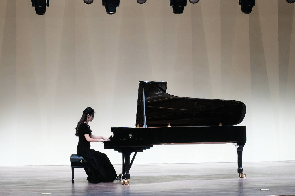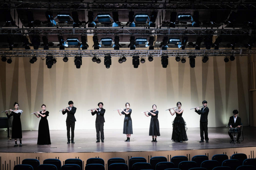 下半场器乐专场,管乐合奏《没有共产党就没有新中国》和长笛重奏《游击队之歌》,两首红色经典乐曲再次掀起音乐会的高潮;筝乐团重奏《瑶族舞曲》、古筝演奏《西部主题畅想曲》《行者》以抒情优美的旋律,粗犷强烈的节奏,描绘出少数民族的人文风情;《中国畅想曲第二号—舞曲》《哈尼情歌》《平湖秋月》《花鼓春吟》《森林的呼啸》《激流》《d小调奏鸣曲》等作品,学生流畅的演奏将浓郁的民族色彩、人与自然、对“福”文化和美好社会的向往完美呈现;钢琴独奏作品《皮黄》将传统京剧和钢琴艺术进行了完美整合,展现出独具魅力的意韵。器乐演奏专场上学生专业演奏技能的演绎,让民族乐器与西洋乐器的美妙乐声久久回荡在音乐厅。