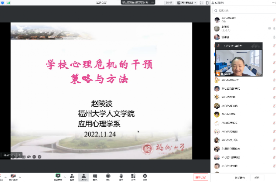 为了切实推进学校心理健康教育工作,提升广大师生身心健康水平、发展师生心理危机事件的干预和预防能力、促进学生身心健康发展。11月24日,人文与管理学院邀请了福州大学人文学院应用心理学系赵陵波教授,面向学院全体辅导员、心理健康中心、心理专业师生开展心理危机干预专题讲座。
