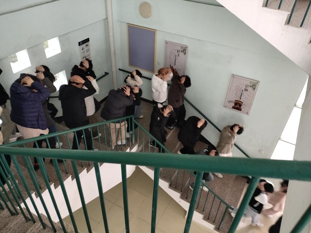 上午9点,“地震”警报的响起,参演师生根据事先的安排,快速到位,双手护头,蹲在课桌下或教室承重墙的角落,随着“疏散”警声响起,全体师生按照预定的疏散路线迅速、有序地撤离到户外活动场地安全地带,当师生到达安全区域后,指挥人员及时巡查清点人数,做好防护工作。