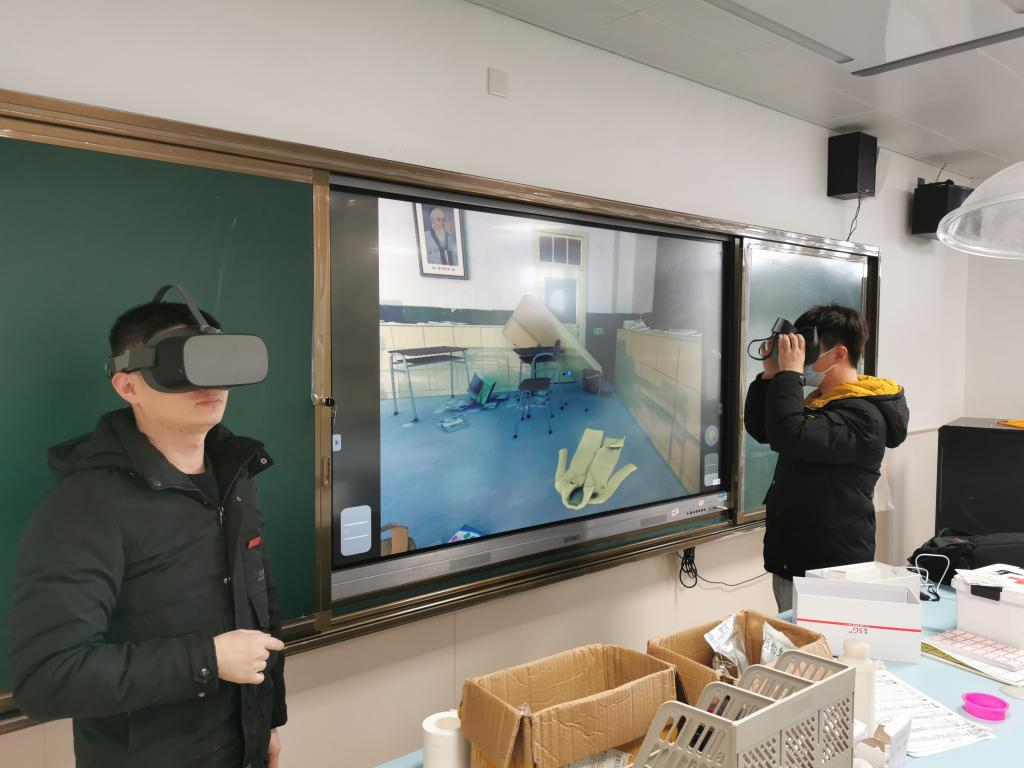 在化学实验室里,卓文豪先进行了化学实验室安全知识的培训,同时结合挂在墙上的消防栓及走廊上的消防柜,演示了消防灭火器以及灭火毯的使用方法,并让同学们亲自演练、掌握灭火技能。对化学实验室里发生火灾时如何保持冷静,科学地判断火情,选择正确的逃生路线等方面,两位老师均做出了具体分析。同学们在本次的消防安全教育颇有收获。演练中,同学们还带上了VR设备,感受了真实的火灾场景,身临其境地学习了如何从火灾中逃生。