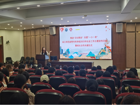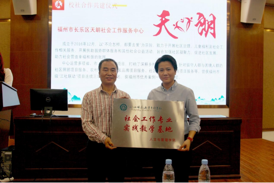 主题宣传活动在图书馆一楼的学术报告厅举行,活动现场介绍了人文与管理学院社会工作专业深耕基层社会治理,积极推进五社联动的经验与成果,并展示了历届优秀毕业生代表,展现了专业发展的累累硕果。活动现场学院与三家社会工作服务中心签订共建协议,向三家社工机构的代表授予“实践教学基地”牌匾及三本校本教材《福州方言与文化》(省终身教育优秀乡土教材)、《社会工作实务工具书》、《社会工作游戏指导手册》,共同开启校社共建新篇章。据悉,此次共建将为社工专业拓展超过30个就业岗位,并进一步搭建专业实训实践及教学科研的平台。