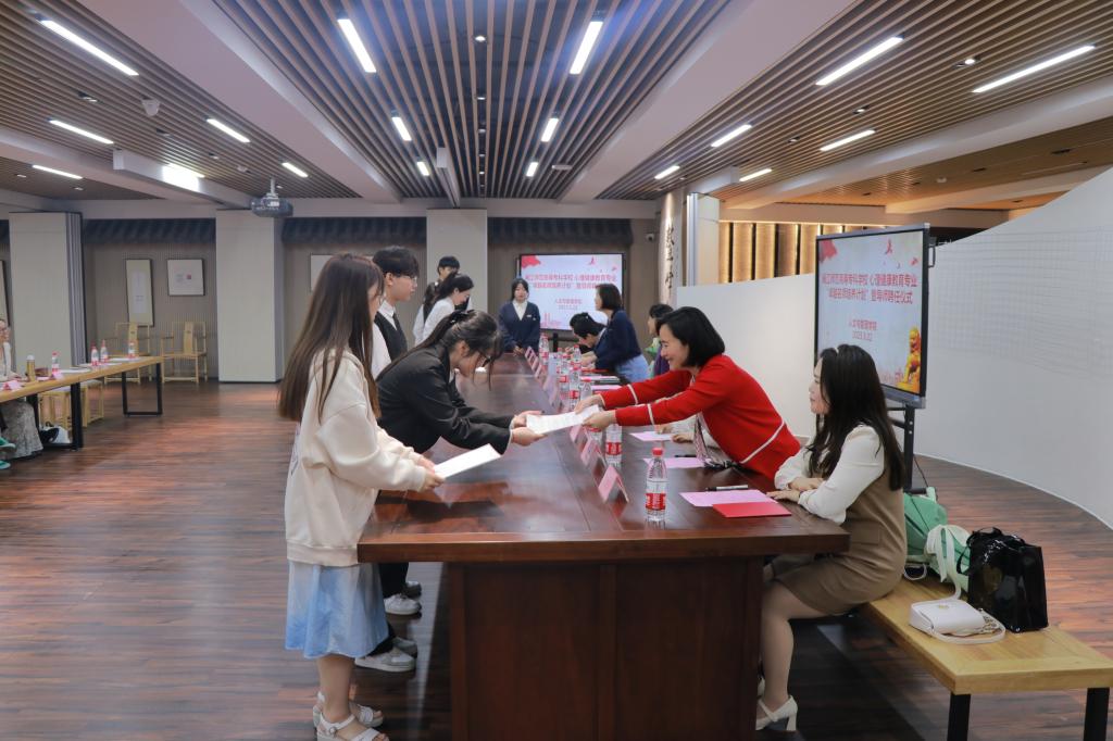 22级心理健康教育专业王师阳同学代表全体学徒表达作今后三年专业成才成长的承诺、信心和决心。六名学生代表上台现场签订师徒协议书,为行业导师献花和学院文创纪念品以表示感谢与敬意。