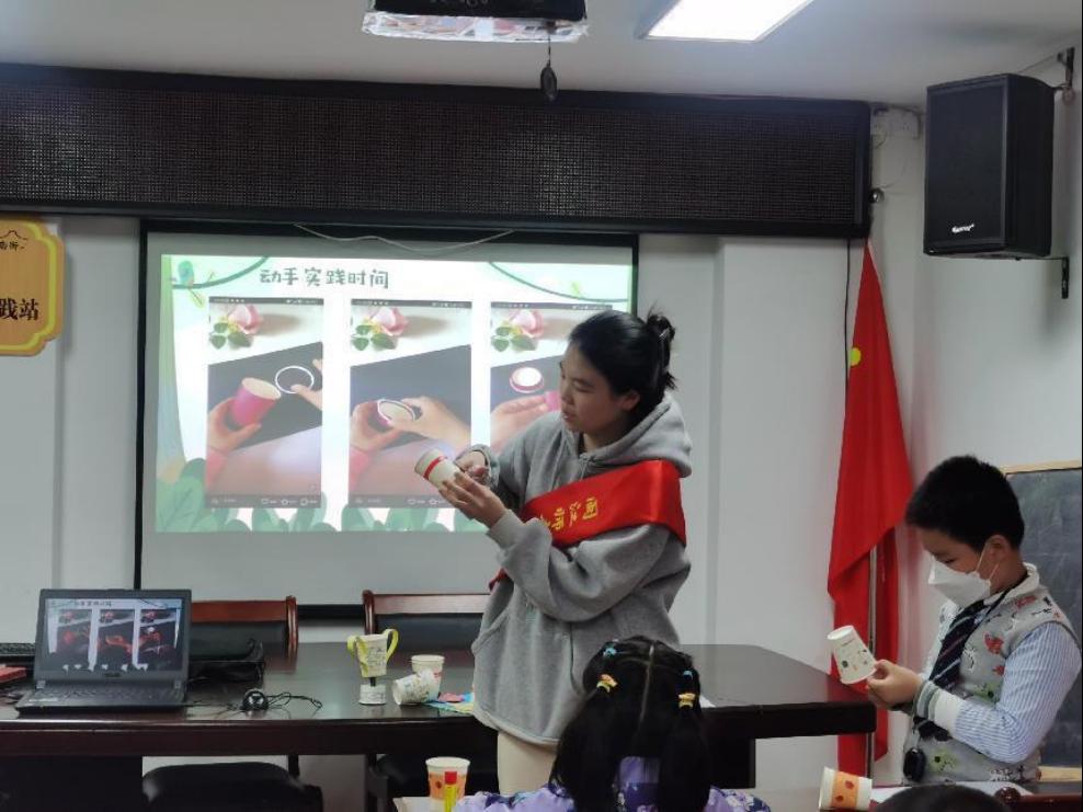 我有一双小巧手。在家长的陪同下,志愿者们现场教授小朋友们纸杯花的制作方法,耐心指导小朋友们用剪刀裁剪纸片、用画笔涂上颜色,不一会儿,一个个精致的纸杯花就在小朋友们的手中诞生了。