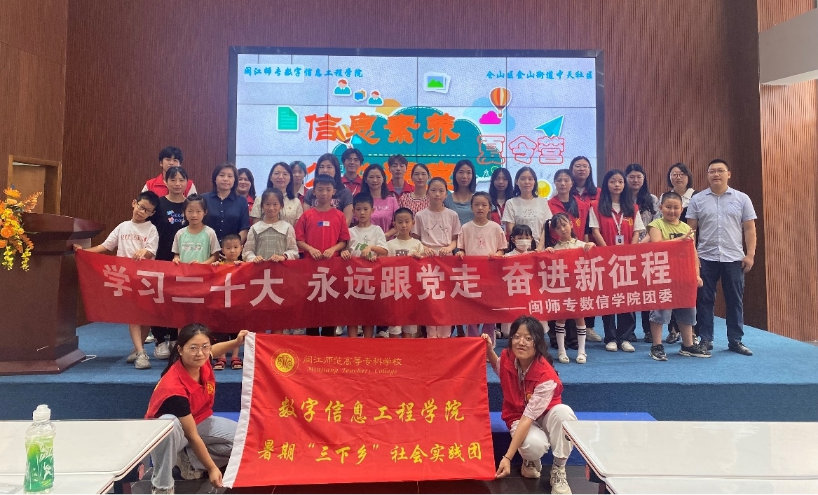 7月1日上午,数字信息工程学院开办的“信息素养公益课堂”,在结对共建单位仓山区金山街道中天社区顺利开课。学院党委副书记董秋锋、学院各基层党组织书记,院组织员杨忠强,由学生党员代表和积极分子代表组成的社会实践团队成员,中天社区党委书记陈卉、天骄苑书记温美姜及中天社区的小朋友和家长共同参加了课堂开班仪式。