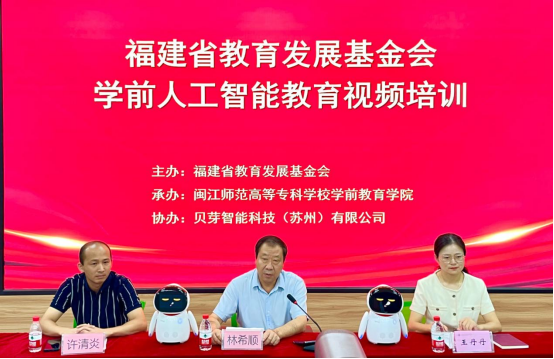 8月30日上午,由福建省教育发展基金会主办,学前教育学院承办的学前第二次人工智能教育培训会议在3016教室开展,本次会议也同步在线上实时直播,全省108所幼儿园的园长、副园长以及负责该项目的580余名教师参加培训。福建省教育发展基金会副会长兼秘书长林希顺主持会议,捐赠企业贝芽科技(苏州有限公司)副董事长许清炎,学前教育学院副院长王丹丹出席培训会议。