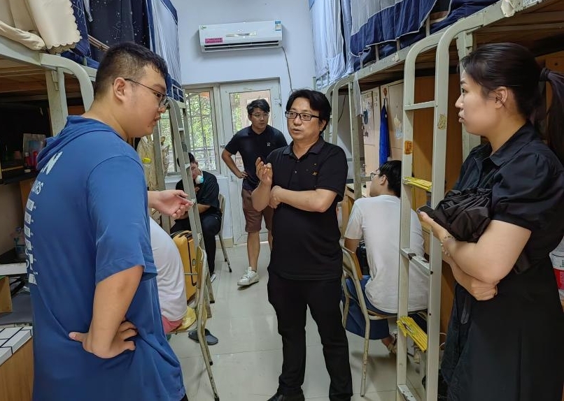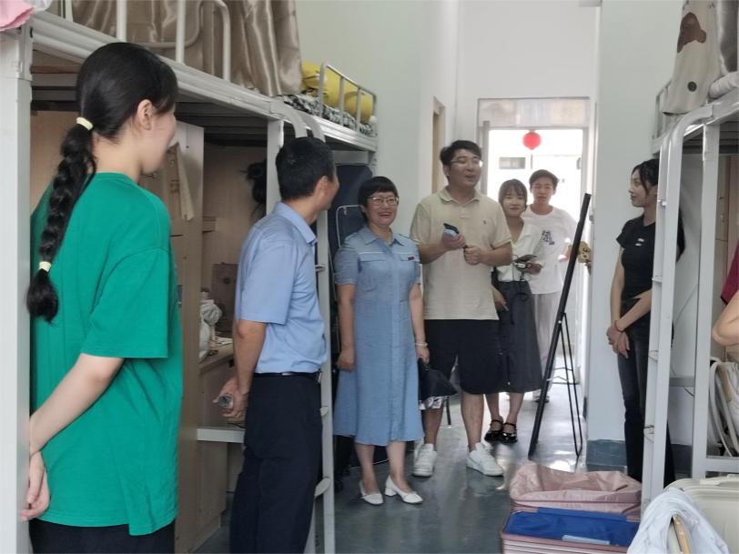 艺术学院党委书记江柳青、院长徐青、副院长方晶带领新生班级班主任、辅导员走访宿舍,关心学生的入住感受、宿舍情况,一一落实学生提出的困难和问题,让新生感受到学院领导老师的温情关怀。