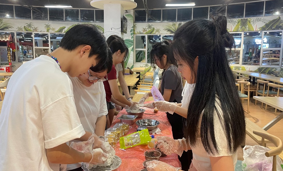 指导老师详细讲解了月饼的制作过程,并为大家准备好制作月饼的材料。学生党员与少数民族学生们将热水倒入冰皮月饼预拌粉中,揉搓面团至成型。随后历经捏团、放馅料、搓圆、模具压制等一道道工序,一个个精美的冰皮月饼制作而成。大家品尝着以“情”为皮、以“爱”为馅的月饼,感受着中华民族传统节日的魅力,拉进了师生、学生之间的距离。