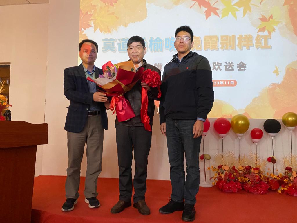 李铨雄与大家分享了自己在工作岗位上奋斗了三十九年的体会和感言,学院党总支书记王华为铨雄老师佩戴红花,院长陈宗保送上鲜花,与会人员纷纷向李铨雄送上最诚挚的祝福。