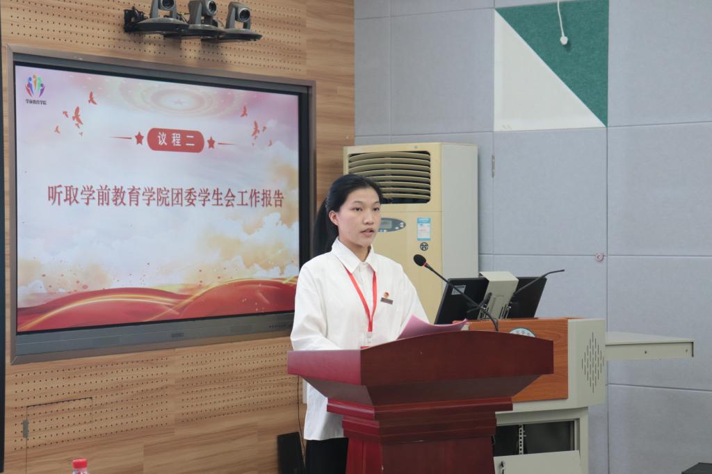 丘苏兰代表学前教育学院学生会作工作报告。报告从加强思想政治引领,打造特色品牌活动,搭建网络新媒体矩阵,深化组织体系改革等四个方面回顾了学前教育团委学生会过去的工作,并表示学前教育学院团委学生会将认真学习贯彻习近平新时代中国特色社会主义思想和党的二十大精神,积极开展各项工作,为学生的全面发展和校园文化建设做出更大奉献。
