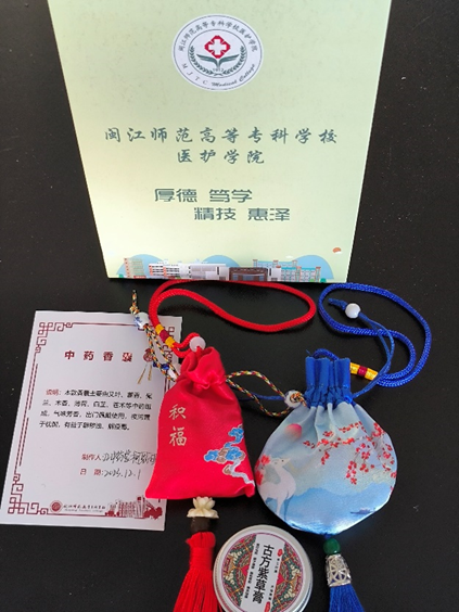 中药香囊由周雅芳、柯莹莹、吕紫云、洪小青、曹玲珑(22药学1班)组织同学们完成,精心选用艾叶、藿香、佩兰、木香、薄荷、白芷、苍术等中药,经过打粉、过筛、装袋,训练学生形成标准规范的操作,培养学生严谨的工作态度。