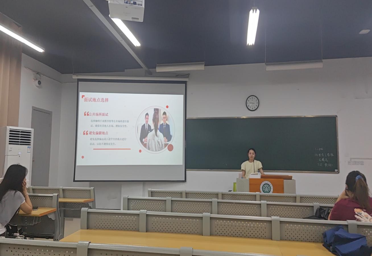 在活动中,老师们围绕 “求职安全认知”、“面试安全”、“租房安全”和“职场安全” 四个模块展开详细讲解,并结合案例剖析求职过程中的安全隐患及预防措施,提醒同学们要增强信息安全意识、风险防范意识与依法维权意识。