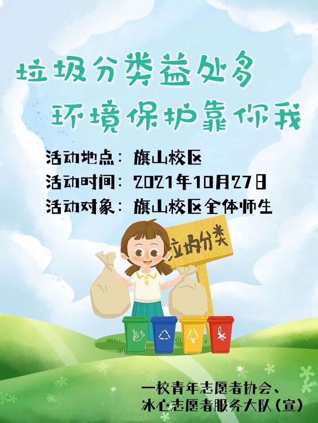 为了增强同学们保护环境的意识,弘扬时代新风,用实际行动践行垃圾分类、环境保护理念。2021年10月27日,由大赢家体育app下载团委主办、校青协志愿会承办、校冰心志愿者服务大队协办的“垃圾分类益处多 环境保护靠你我”主题志愿服务活动在大赢家体育app下载开展。
