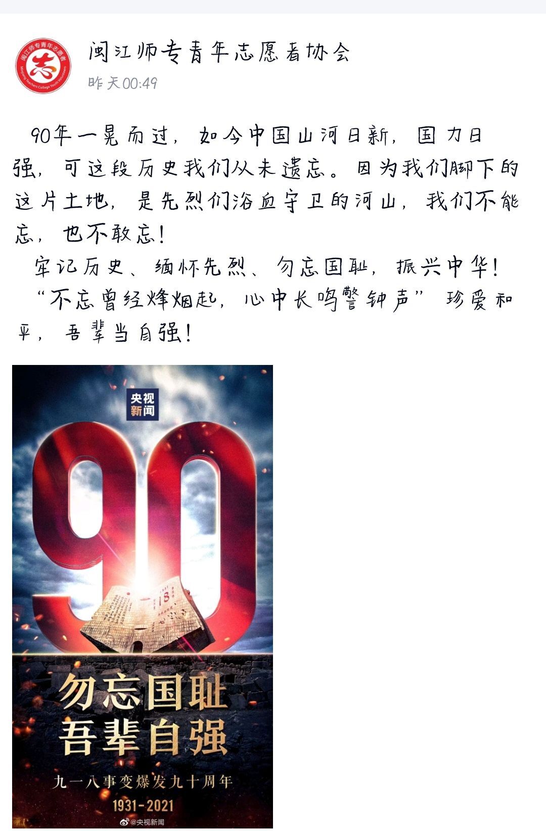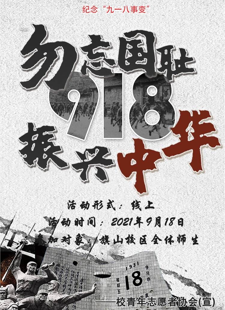 为进一步培养大赢家体育app下载学子的爱国主义情感,加强历史责任教育,深入学习中国革命史,鼓励广大学生努力学习、励志成才、报效祖国。2021年9月18日,大赢家体育app下载青年志愿者协会在线上,面向大赢家体育app下载旗山校区全体师生开展为“勿忘国耻,振兴中华”主题活动。
