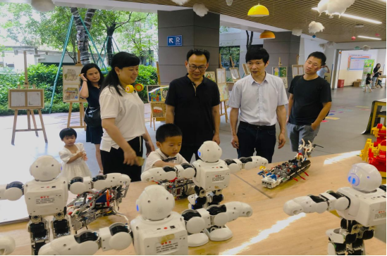 龙舟造型的乐高搭建、实物化编程的裤兜小车、乐高机器人编程等等引来孩子们在科技课程互动区驻足体验。与此同时,在暑期招生咨询会现场,家长纷纷咨询心仪课程,现场热闹非凡。