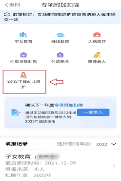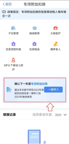 二、在“确认下一年度专项附加扣除”中选择“一键带入”。将带入2022年度信息,选择“确定”。