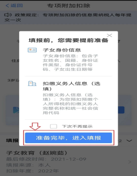 选择扣除年度为“2023”,点击“准备完毕,进入填报”。根据系统提示进行相关信息填写,即可增加新的专项附加扣除信息。