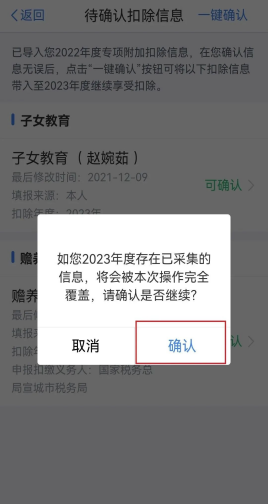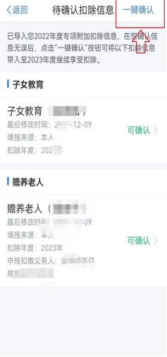 若您2023年的专项附加扣除信息无变动,只需在2022年基础上确认即可,点击右上角“一键确认”按钮;确认信息后点击“确认”,信息则提交成功。