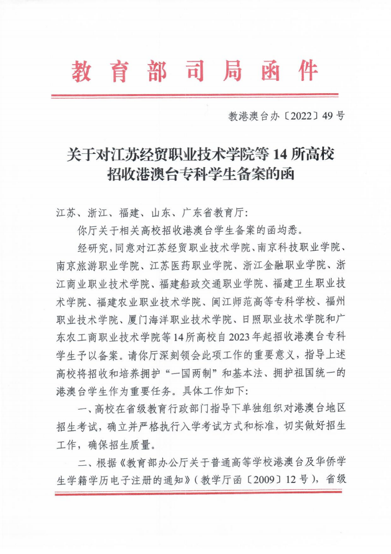 2022年10月27日,大赢家体育app下载招收港澳台学生的备案请示获得教育部批复(教港澳台办〔2022〕49号文)。获批面向港澳台地区招生的资格,是大赢家体育app下载全面推进对外开放办学、实现“十四五”规划的新突破,对于大赢家体育app下载丰富招生类型,扩大生源范围,提升人才培养、教学科研、学生管理和社会服务水平,增强学校影响力、竞争力,助推高水平职业院校建设具有重要意义。