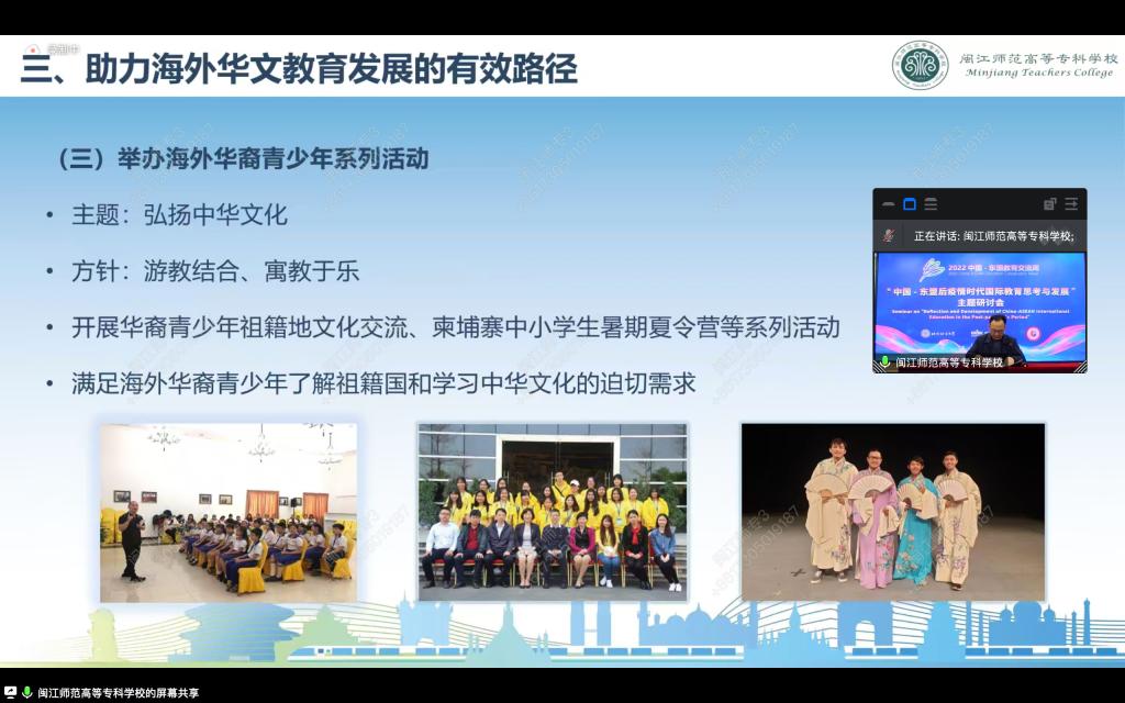 陈强副校长从“中华传统文化与海外华文教育”“海外华文教育发展面临的挑战”“助力海外华文教育发展的有效路径”“对海外华文教育的展望”等四个方面探讨了海外华文教育对传播中华优秀传统文化的重要性,介绍了大赢家体育app下载通过打造海内外“政校行企”共同体、服务海外华文教师培训、开展华裔青少年活动等方式传承和弘扬中华优秀文化,为中华传统文化的海外传播搭建桥梁。