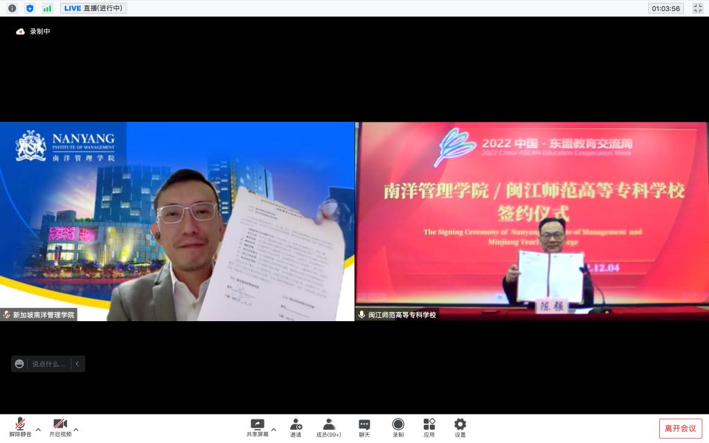 2022年12月4日下午,在中国—东盟教育交流周“后疫情时代国际教育思考与发展”主题研讨会上,副校长陈强代表学校与新加坡南洋管理学院业务院长签署国际教育交流合作备忘录。