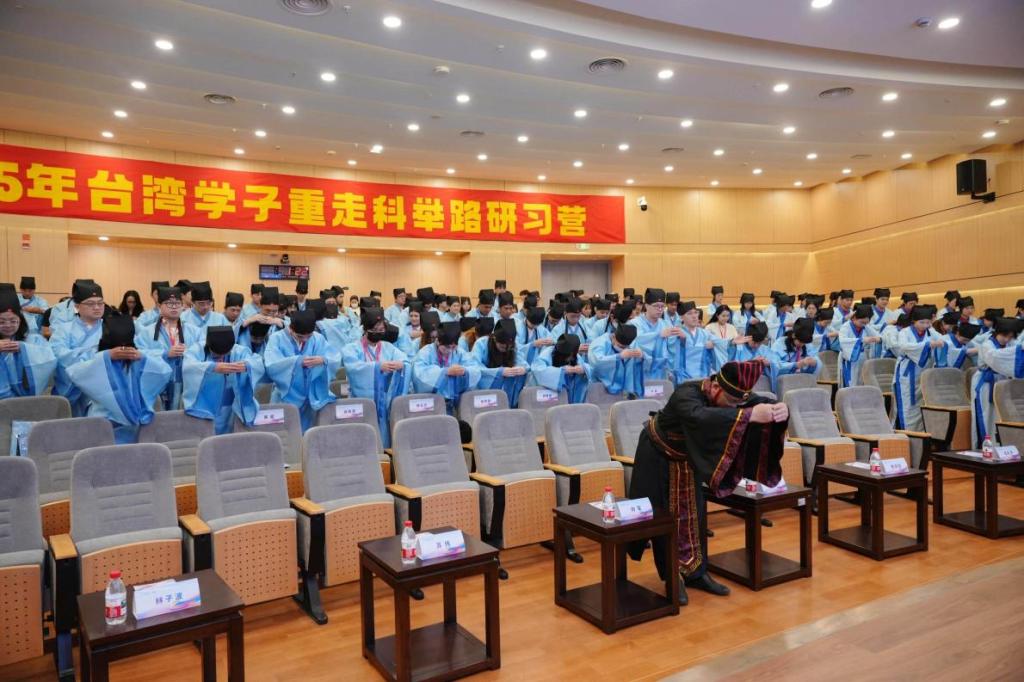在模拟乡试活动中,闽江学院人文学院毛晓阳教授为两岸青年学子作《清代台湾宾兴:联结两岸科举的公益桥梁》专题讲座,并带领大家身着汉服肃整衣冠,行敬拜先师之礼,进行“云游科举路”互动体验,并现场“乡试”,沉浸式体验科举文化。期间,与会嘉宾与两岸青年一同观看《台湾学子重走科举路研习营》纪录片,回顾2018年以来两岸青年学子沿着当年台湾士子科举之路,追循两岸文化根脉,缅怀先贤、寻根问祖,共同见证两岸同胞割舍不断的血脉亲情和共同的历史传承与文化记忆的历程。
