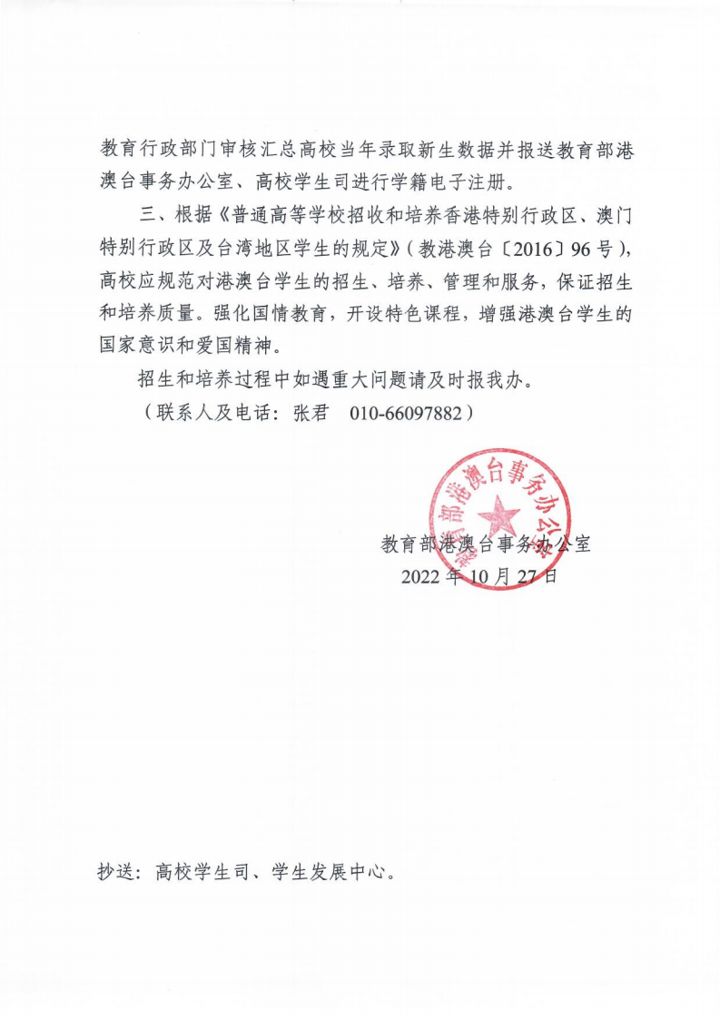2022年10月27日,大赢家体育app下载招收港澳台学生的备案请示获得教育部批复(教港澳台办〔2022〕49号文)。获批面向港澳台地区招生的资格,是大赢家体育app下载全面推进对外开放办学、实现“十四五”规划的新突破,对于大赢家体育app下载丰富招生类型,扩大生源范围,提升人才培养、教学科研、学生管理和社会服务水平,增强学校影响力、竞争力,助推高水平职业院校建设具有重要意义。
