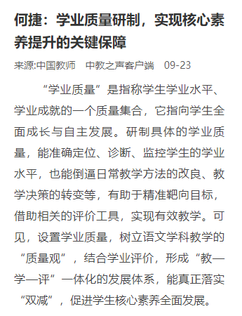 “学业质量”是指称学生学业水平、学业成就的一个质量集合,它指向学生全面成长与自主发展。研制具体的学业质量,能准确定位、诊断、监控学生的学业水平,也能倒逼日常教学方法的改良、教学决策的转变等,有助于精准靶向目标,借助相关的评价工具,实现有效教学。可见,设置学业质量,树立语文学科教学的“质量观”,结合学业评价,形成“教—学—评”一体化的发展体系,能真正落实“双减”,促进学生核心素养全面发展。