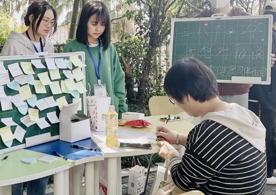 书信传递温暖。3月7日-8日,青春健康基地在仓山校区十二号楼广场搭建互动平台,以留言展板相互交流的模式,同学们通过便签、纸条和信封,给未成谋面的“她”留下“爱心纸条”,写下积极鼓励的话语,或自己的困扰,再抽取他人留下的“爱心纸条”,感受生活中未成见面的温暖,并为“她”留下的青春困扰提供解决思路。活动现场,收集箱里装满了信封与纸条,许多同学还在信件的封面上制作了手绘涂鸦,每一个手工制作的精美信封、每一句温暖的话语、每一段真诚的文字,都满满装载着师生们的鼓励与支持。