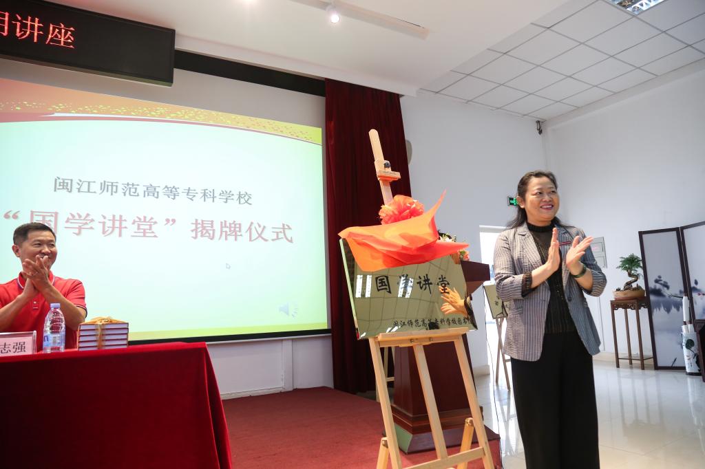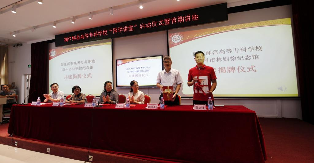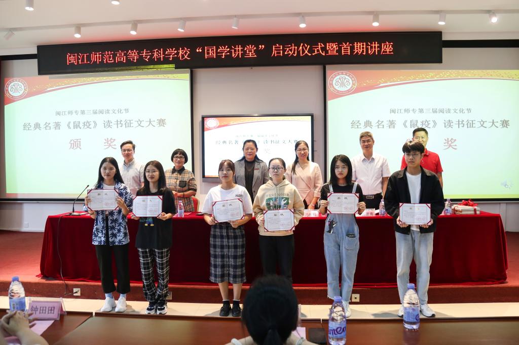 仪式场外琴音绕梁,场内国学氛围布置浓厚,林旻副校长为“国学讲堂”启动揭牌,董志强馆长与陈继勇馆长互赠闽江师专图书馆与福州市林则徐纪念馆的共建牌匾和书籍,由王海波副书记宣读了闽江师专第三届阅读文化节系列活动之经典名著《鼠疫》读书征文大赛获奖名单,主席台各位领导嘉宾还为林雯婕等10位获奖者进行颁奖。仪式最后,林旻副校长对“国学讲堂”的顺利启动表示热烈祝贺,对共建单位福州市林则徐纪念馆表示衷心的感谢,并向莅临现场的嘉宾和老师同学们表示了节日的问候。林旻副校长提出三点希望,一是希望学校能秉承优良传统,传承国学文脉,精心守护“国学”这一精神家园;二是希望同学们能理解国学教育的重大意义,要“学得进、走得出、用得上”;三是希望福州市林则徐纪念馆等更多有识之士能携手闽江师专,共同为国学昌盛尽一份绵薄之力,使“国学讲堂”日臻茁壮,使“千年国学”生生不息。