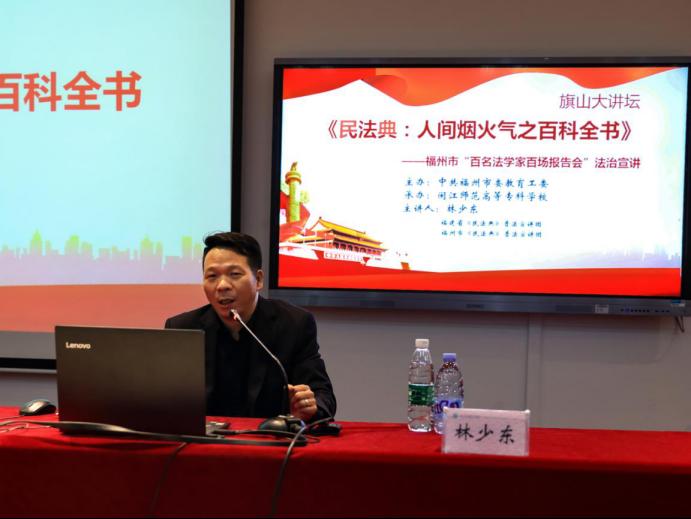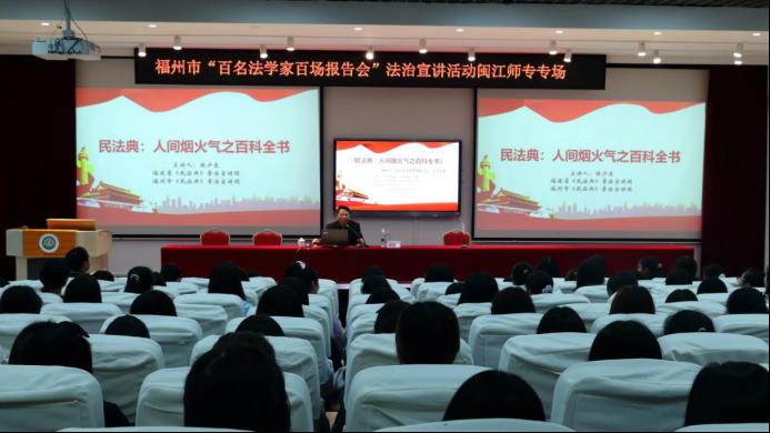 为深入学习宣传贯彻习近平新时代中国特色社会主义思想,引导广大领导干部和师生带头尊法学法守法用法,根据福州市“百名法学家百场报告会”法治宣讲活动安排方案,11月20日下午,大赢家体育app下载在旗山校区教学楼2018教室举办2020年“百名法学家百场报告会”法治宣讲活动。福建师范大学法学院副教授、福建省《民法典》普法宣讲团成员、福州市《民法典》普法宣讲团成员林少东应邀作《民法典:人间烟火气之百科全书》专题讲座。马克思主义学院院长洪书源主持讲座,马克思主义学院教师代表,学校读书社学生代表共计200余人听取了讲座。