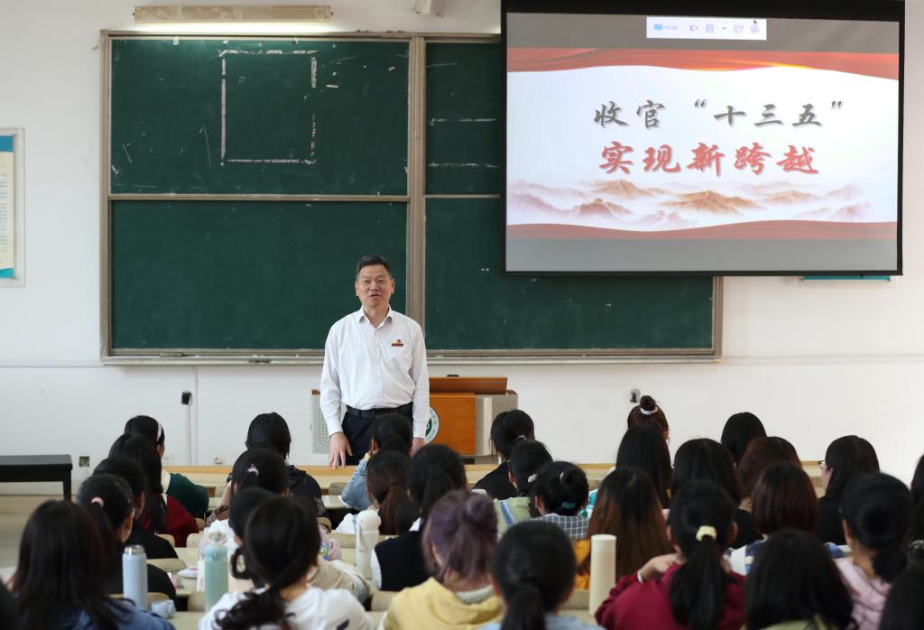 3月17日,陈荣生书记以《收官‘十三五’实现新跨越》为题,为2020级外语系和初等教育系学生上形势与政策课。他围绕“十三五”时期我国决胜脱贫攻坚取得决定性胜利、经济高质量发展取得的新成就以及各项民生事业不断繁荣发展,各项民生指标不断改善等方面内容,向学生讲述5 年来我国经济社会发展取得的全方位、开放性历史成就,让学生看到中华民族伟大复兴向前迈出了新的一大步,社会主义中国以更加雄伟的身姿屹立于世界东方。让学生深刻认识到,这些来之不易的伟大成就,是以习近平同志为核心的党中央坚强领导的结果,是中国特色社会主义制度优势充分彰显的结果,是广大人民群众团结奋进、开拓进取的结果。