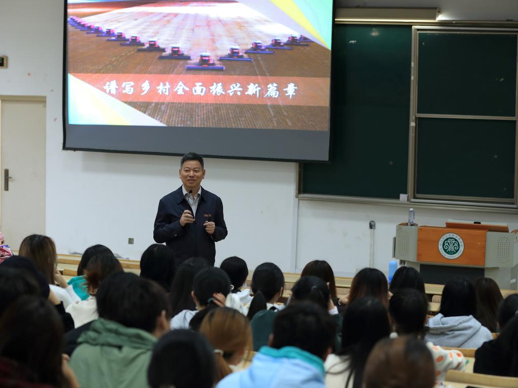 11月17日,陈荣生书记以《谱写乡村全面振兴新篇章》为题,分两场为2021级应用外语班、2021级小学数学教育班学生上形势与政策课。他结合习近平在闽工作17年半从厦门军营村、“英雄三岛”到宁德“三进下党”“四下基层”的扶贫故事,围绕“‘三农’思想”“新时代广大农民群众对美好生活的向往”“实现强国梦的必然要求”和“国家安全”,提纲挈领、深入浅出阐释了全面推进乡村振兴战略实施的重要意义。课上,结合紧贴实际的案例分析、丰富详实的数据图表,引导学生直观感受国家脱贫攻坚战取得全面胜利的伟大成就,鼓励学生分享家乡新发展新变化,同学们踊跃回答。他以富有思想性、理论性、实践性和指导性的语言,引导学生强化使命担当,为乡村振兴贡献青春力量。