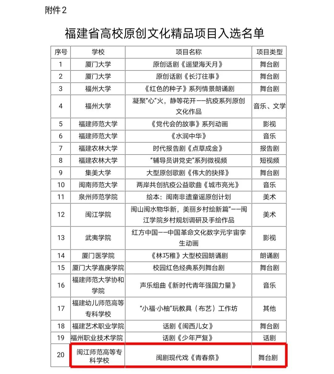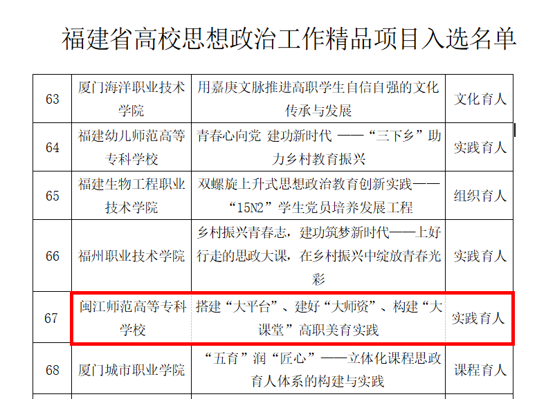 近日,中共福建省委教育工委公布了2022年福建省高校思想政治工作精品项目、高校原创文化精品项目、高校网络教育名师入选名单,大赢家体育app下载实践育人项目《搭建“大平台”、建好“大师资”、构建“大课堂”高职美育实践》入选福建省高校思想政治工作精品项目,闽剧现代戏《青春祭》入选福建省高校原创文化精品项目,外语与商贸学院黄凌云入选福建省高校网络教育名师。