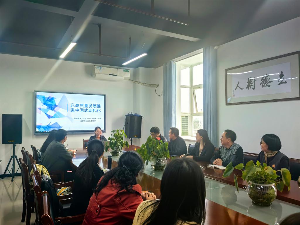 马克思主义学院第二支部书记张兆延以“以高质量发展推进中国式现代化”为主题,为全体党员同志讲授主题党课。张兆延带领老师们一起领悟中国式现代化道路是一条完全不同于西方的现代化道路,是一条史无前例、独具中国特色的现代化发展之路;高质量发展是实现中国式现代化的重要抉择。