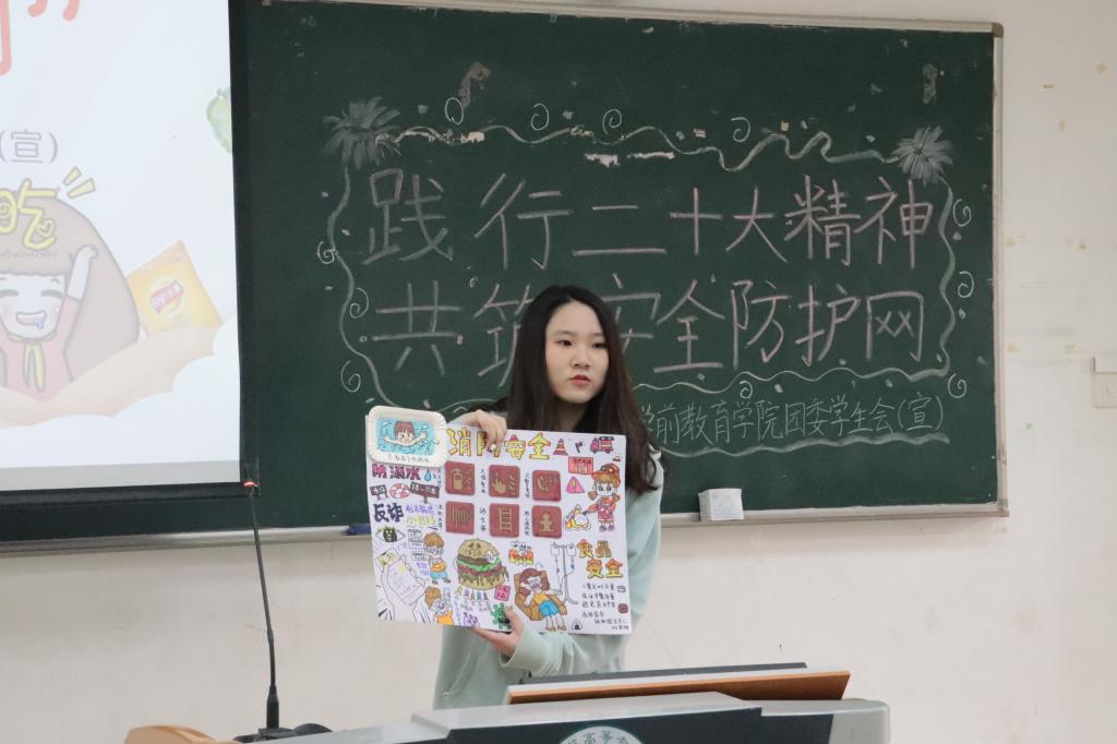 为全面贯彻落实党的二十大精神,做好安全宣传工作,提高学院学子的安全防范意识,3月23日,学前教育学院于旗山校区教学楼1002教室开展了以“践行二十大精神,共筑安全防护网”为主题的作品评选活动。