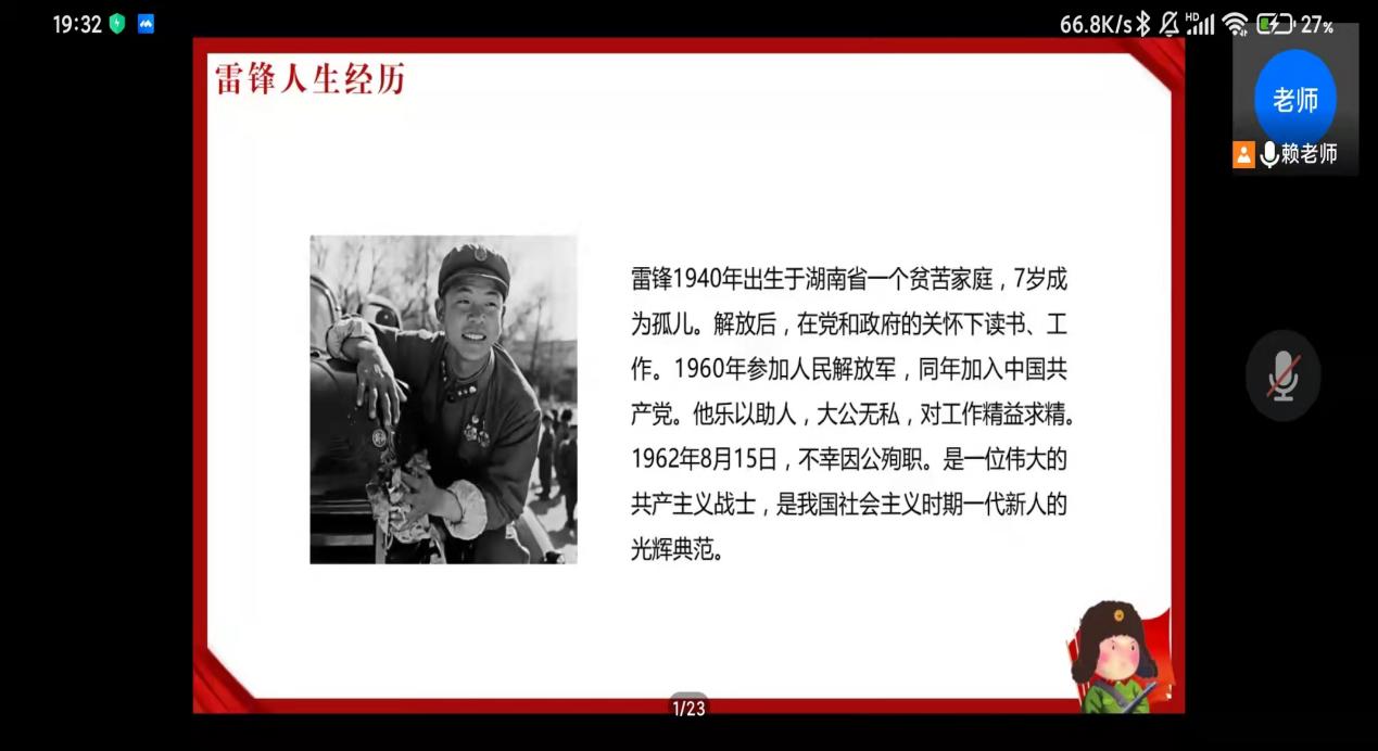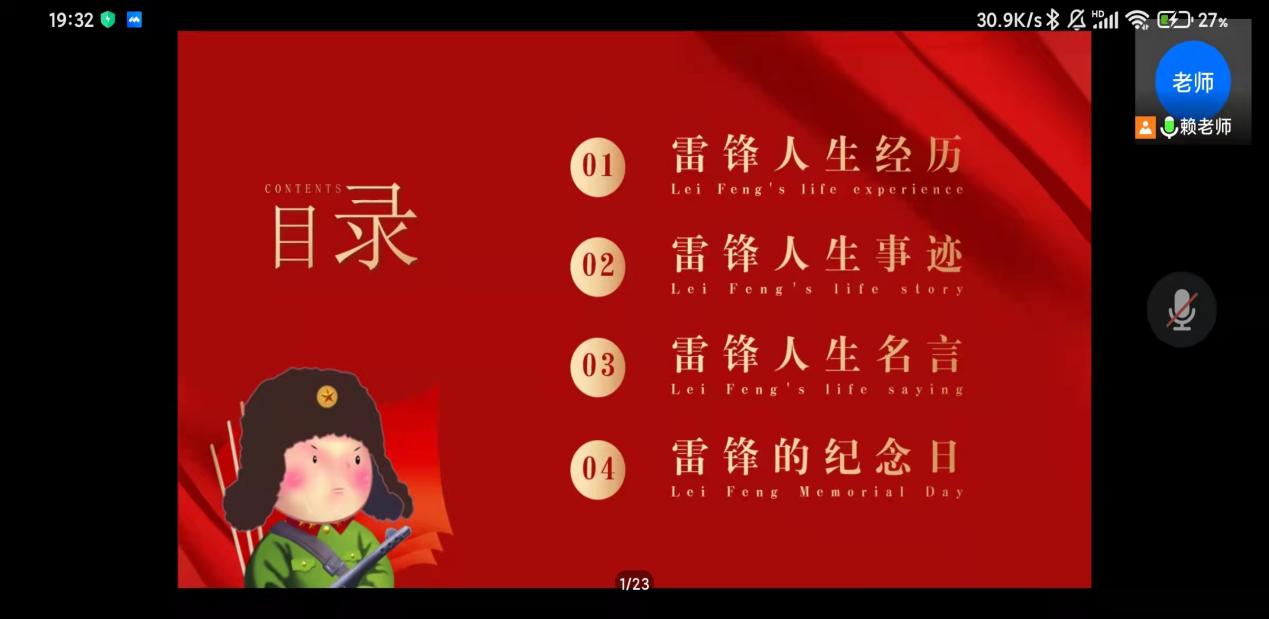 会上,赖老师主要向同学们传递了坚持不懈、奉献自我的雷锋精神。她从雷锋的人生经历、生平事迹、名言与雷锋纪念日四个方面展开,向大家介绍了雷锋同志“人民勤务员”、“可敬的傻子”、“全连的四好班长、模范班长”等事迹,鼓励同学们学习乐于助人、奉献自我的雷锋精神。在对雷锋日记的解读中,让学生明白了雷锋精神的核心是爱,雷锋精神的灵魂是感恩,懂得如何去爱,如何去感恩。