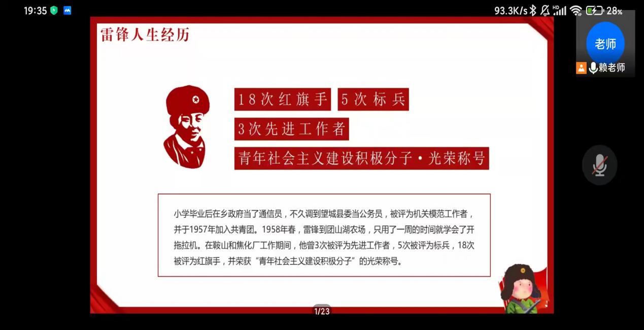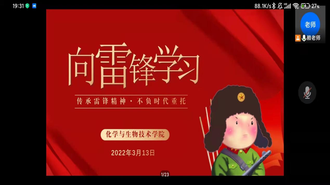 为了引导学生树立正确的世界观、人生观、价值观,学习雷锋精神,培养勤俭、奋斗、创新、奉献的崇高精神,化学与生物技术学院于2022年3月13日线上开展“传承雷锋精神,不负时代重托”主题班会。