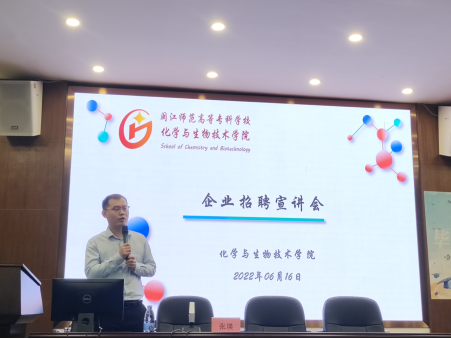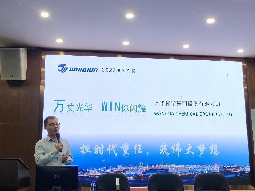 为切实做好化学与生物技术学院毕业生就业工作,大力构建毕业生与用人单位的交流平台,拓宽毕业生就业渠道,向用人单位输送应用型人才,化学与生物技术学院于2022年6月16日在学术报告厅开展了企业招聘宣讲会,万华化学集团股份有限公司人资负责人主讲。