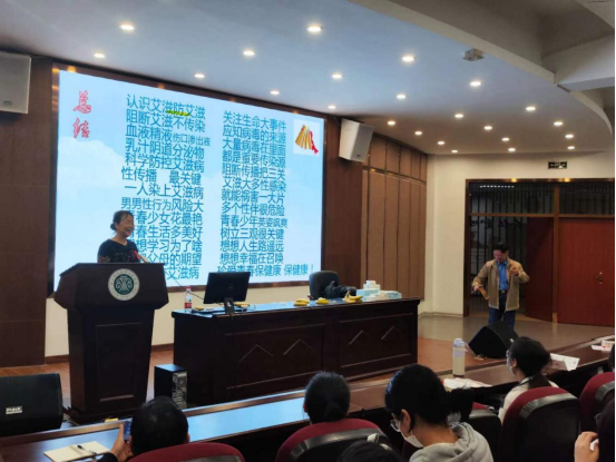 在讲座上,徐瑜从“艾滋病主题”“生殖健康简介”“艾滋病知识有奖竞答”“防艾基本知识”“角色扮演”五个环节展开。她巧妙运用生动的语言、鲜活的案例和触目惊心的图片详细分析了不健康的性生活带来的影响,介绍了艾滋病的危害与相关防范知识,提高同学们对艾滋病的了解。同时,她以有奖竞答的方式调动同学们学习防艾知识的兴趣,活动现场同学们积极参与,气氛活跃,真正做到艾滋病预防知识入脑入心。最后,徐瑜呼吁同学们要自尊自爱,养成良好健康的生活习惯,合力共创无“艾”未来。