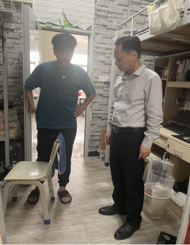 王华和辅导员前往13号楼男生宿舍走访,询问2022级学生学习情况,提醒同学们要安排好学习时间,认真备考专业技能证;了解宿舍内供电、供水等情况,指导同学们宿舍通风、打扫卫生、整理物品,注意防盗。张瑛就学习、生活、工作等学生迫切关心的问题与需求与学生展开交流,详细询问少数民族学生近期在校情况,并给予慰问和鼓励。走访中,学院领导还逐项排查了宿舍安全隐患,检查是否有超载用电、离寝未断电的安全问题,进一步引导学生安全防范意识。