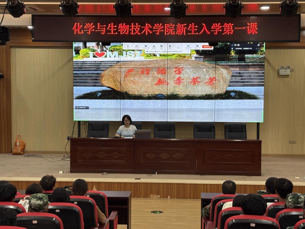 为强化2025级新生思想政治教育,助力新生扣好大学生活的“第一粒扣子”,帮助其迅速适应校园环境,激发学习热情,化学与生物技术学院于2025年9月17日上午以“军训淬炼启新程 大学三年这样过”为主题组织开展“开学第一课”系列教育活动。学院副院长袁晓娟担任主讲人,2025级福清校区全体新生参加。