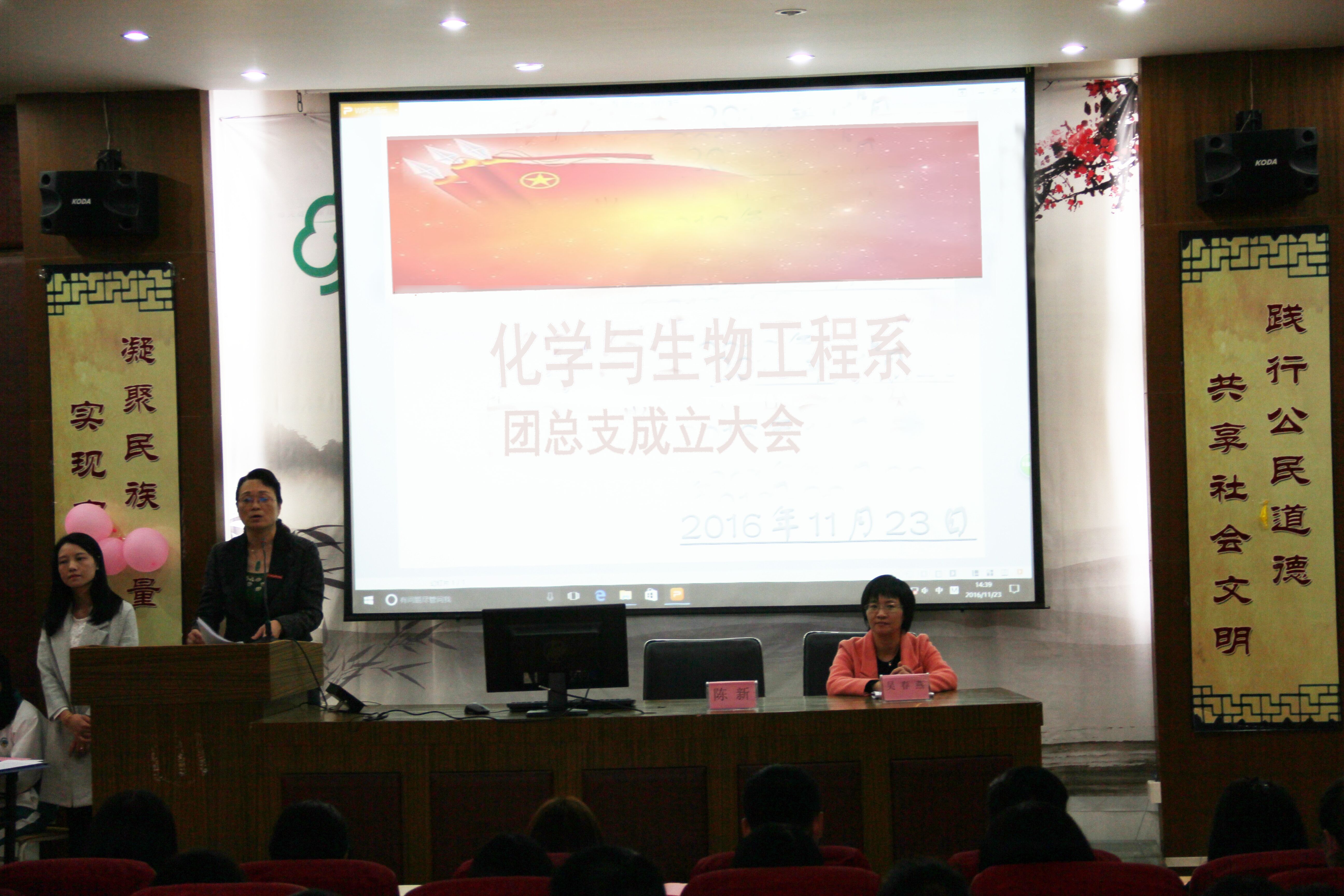 2016年11月23日下午化学与生物工程系于仓山校区学术报告厅召开化学与生物工程系团总支成立大会。参加大会的有校党委副书记陈新、校团委书记吴春艳、系主任林朝阳、系副主任林斌、系副主任黄昌兴以及学生代表。本次大会由詹秀萍老师主持。