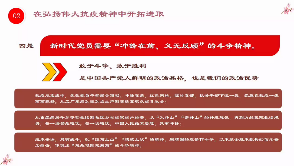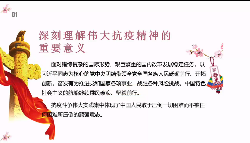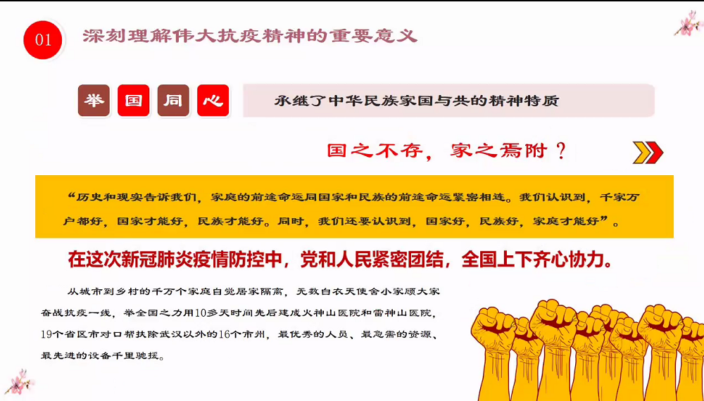 本次党课分为两个部分,一是理解伟大抗疫精神的重要意义、二是在弘扬伟大抗疫精神中开拓进取。张瑛同志描述了新型冠状病毒对我们的生活的影响,也讲述了中国人民用中国力量有效筑牢了遏制疫情蔓延的防线,用中国速度为世界各国贡献了防控疫情的宝贵经验,抗疫斗争伟大实践集中体现了中国人民“和而不同、和合统一“百姓昭明、协和万邦天下为公、天下大同”的人文主义情怀,讲信重情、和衷共济爱好和平的大国道义担当,展现了生命至上、举国同心、舍生忘死、尊重科学、命运与共的伟大抗疫精神。张瑛同志表示:抗击新冠肺炎疫情时,我们应怎样凝聚在一起。在弘扬伟大的抗疫中,作为新时代的党员需要“逆向而行、甘于献身”的英雄精神,需要“勇于担当、不计得失”的使命精神,需要“同舟共济、守望相助”的团结精神,需要“冲锋在前、义无反顾”的斗争精神。号召全体成员在弘扬伟大抗疫精神中开拓进取,尤其是在福建省发现疫情的情况下,弘扬精神,勇担使命,为人民服务。