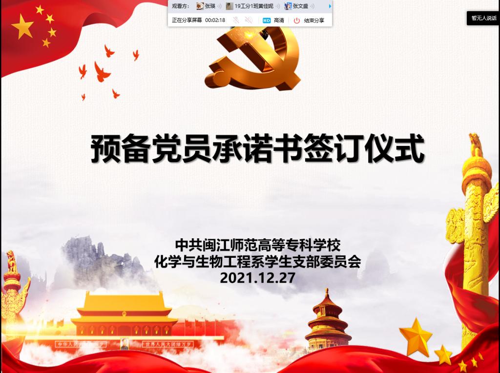2021年12月27日晚19:00,化学与生物工程系学生党支部于线上开展预备党员承诺书签订仪式。党总支副书记张瑛、学生党支部书记赖翠凤、副书记练栅栅,学生党支部全体预备党员参加。