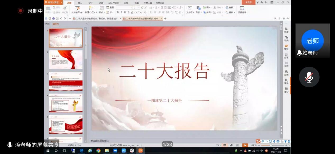 为了深入学习宣传党的二十大精神,深刻领会新时代新青年的责任与使命,勉励广大青年学生主动作为、积极有为,化学与生物技术学院学生党支部于2022年11月9日在腾讯会议召开“学习党的二十大精神”党课,化学与生物技术学院学生党支部书记赖翠凤主讲。