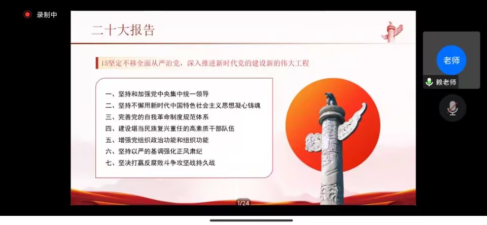首先,赖老师阐明了学习贯彻党的二十大精神的重要意义,要坚定“四个自信”,推进党的自我革命,为全面建设社会主义现代化国家、全面推进中华民族伟大复兴指明前进方向。接着,她解读了党的二十大报告中的新观点、新论断、新思想,帮助学生全面准确学习领会党的二十大精神。她带领学生一同学习、讨论了习近平总书记在党的二十大报告中提出的“有理想、敢担当、能吃苦、肯奋斗”的新时代好青年标准,激励青年学生牢记习近平总书记嘱托,筑牢精神之基,厚植爱国情怀,不负时代,不负韶华,不负党和人民的殷切期望。