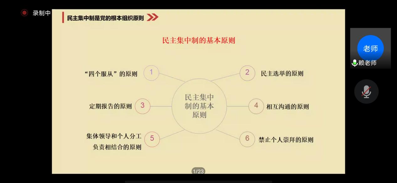 中国共产党之所以从小到大、从弱到强,不断从胜利走向胜利,一个重要原因就是拥有严密组织、严明纪律和优良作风。首先,赖老师介绍了中国共产党的组织——即党的中央组织、地方组织和基层组织,并强调要加强新时代党的组织建设。接着,她解读了党的纪律是党的事业取得胜利的保证,纪律严明是党的光荣传统和独特优势,遵守“六大纪律”,自觉接受党的纪律约束。最后,赖老师通过案例分析了党的作风是党的内在精神,党风问题关系党的生死存亡,要弘扬党的三大优良作风。