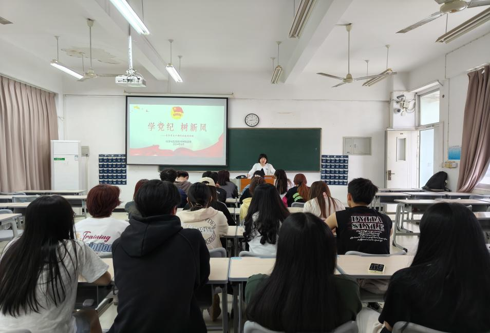 2024年6月5日,化学与生物技术学院在仓5-601A教室开展主题为“学党纪,树新风”的主题团课,加强学生干部作风建设,推动党纪学习教育走实走深。学院团委书记赖翠凤主讲,各班团学干部、青马班学员参加。